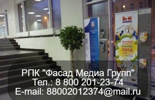 РПК «Фасад Медиа Групп» разместила рекламу для нашего клиента, который владеет сетью кафе и занимается, в том числе доставкой обедов. Реклама размещена в бизнес-центрах. Период размещения рекламы составляет один месяц
