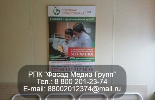 РПК «Фасад Медиа Групп» разместило рекламу в поликлиниках для нашего клиента – Первой семейной стоматологии. Макет для рекламы был разработан дизайнерами нашей компании. Печать и монтаж осуществили наши специалисты. Реклама размещена на 2 месяца